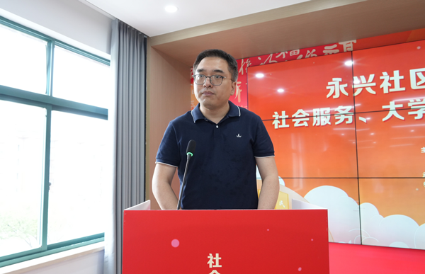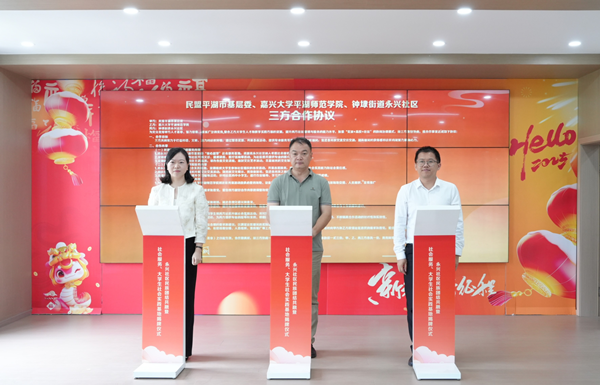 仪式上,三方代表共同签署《结对共建协议》,并顺利揭牌民盟平湖市基层委“永兴社区‘爱心盟芽’社会服务基地”和“嘉兴大学大学生社会实践基地”。平湖经济技术开发区钟埭街道总工会专职副主席张红梅向学院学生代表赠送书籍。