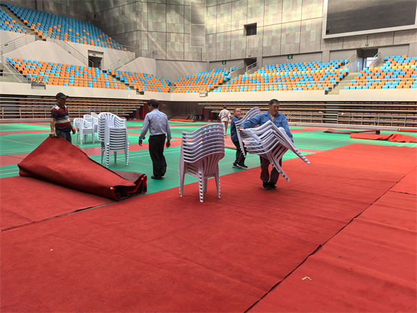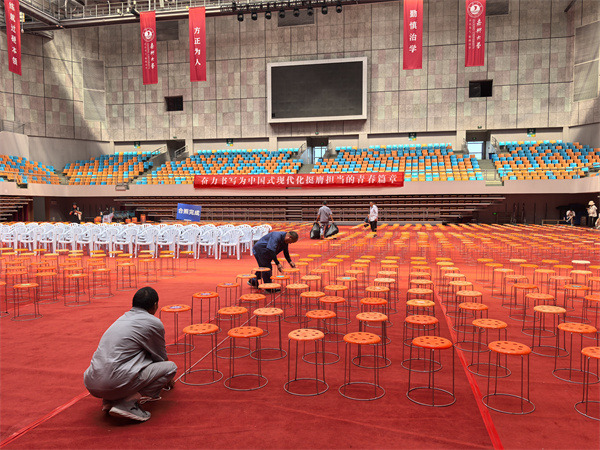 6月18日上午,嘉兴大学2025届学生毕业典礼暨学位授予仪式在梁林校区体育馆举行。为了全面做好此次毕业典礼的场地布置,毕业典礼前,物业服务部员工加班加点、合理统筹,重点落实会场布置和保洁工作;同时提前采购并摆放扶手靠背白色座椅200个,根据典礼现场舞台布置及要求,提前2天组织员工现场摆放1400个圆凳、30盆绿植。修缮服务部认真做好水电供应保障,安排专人对全校高压变配电房、厢式变压器房进行全面细致的检查,确保毕业典礼期间水电正常供应。