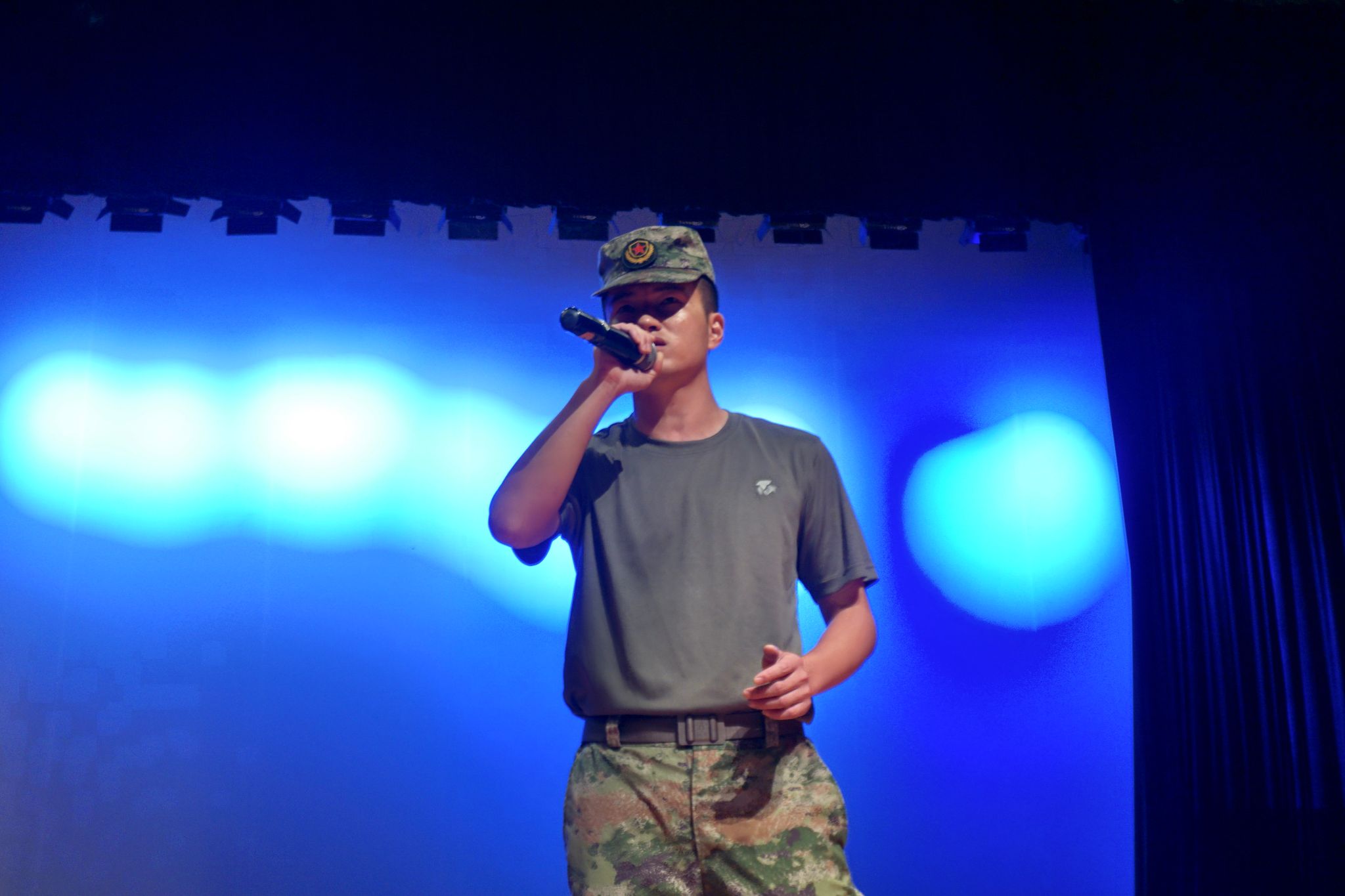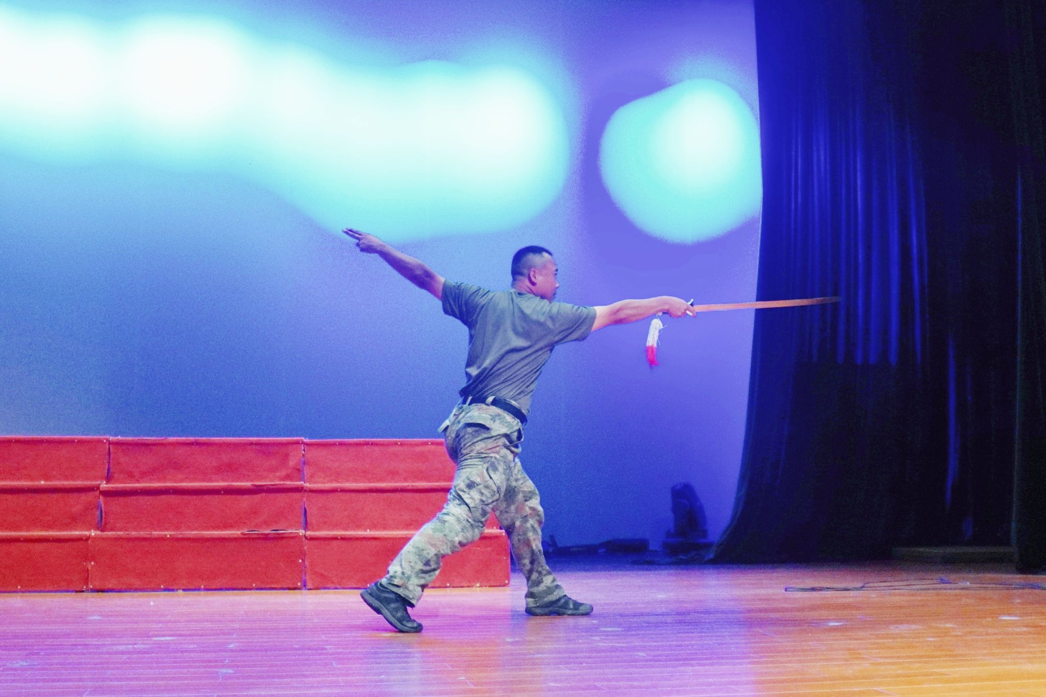 中场环节亮点纷呈。4名学生与2名教官携手演绎《阳光总在风雨后》,这场跨越身份的合唱,生动诠释了“团结”与“坚持”的军训精神内核。张峰教官献唱的英文版《吻别》与《再见》,展现了军人细腻温情的一面;孙峰教官带来的武术器械表演,动作刚劲有力,尽显军人飒爽英姿与过硬本领,瞬间点燃全场气氛,将比赛推向高潮。
