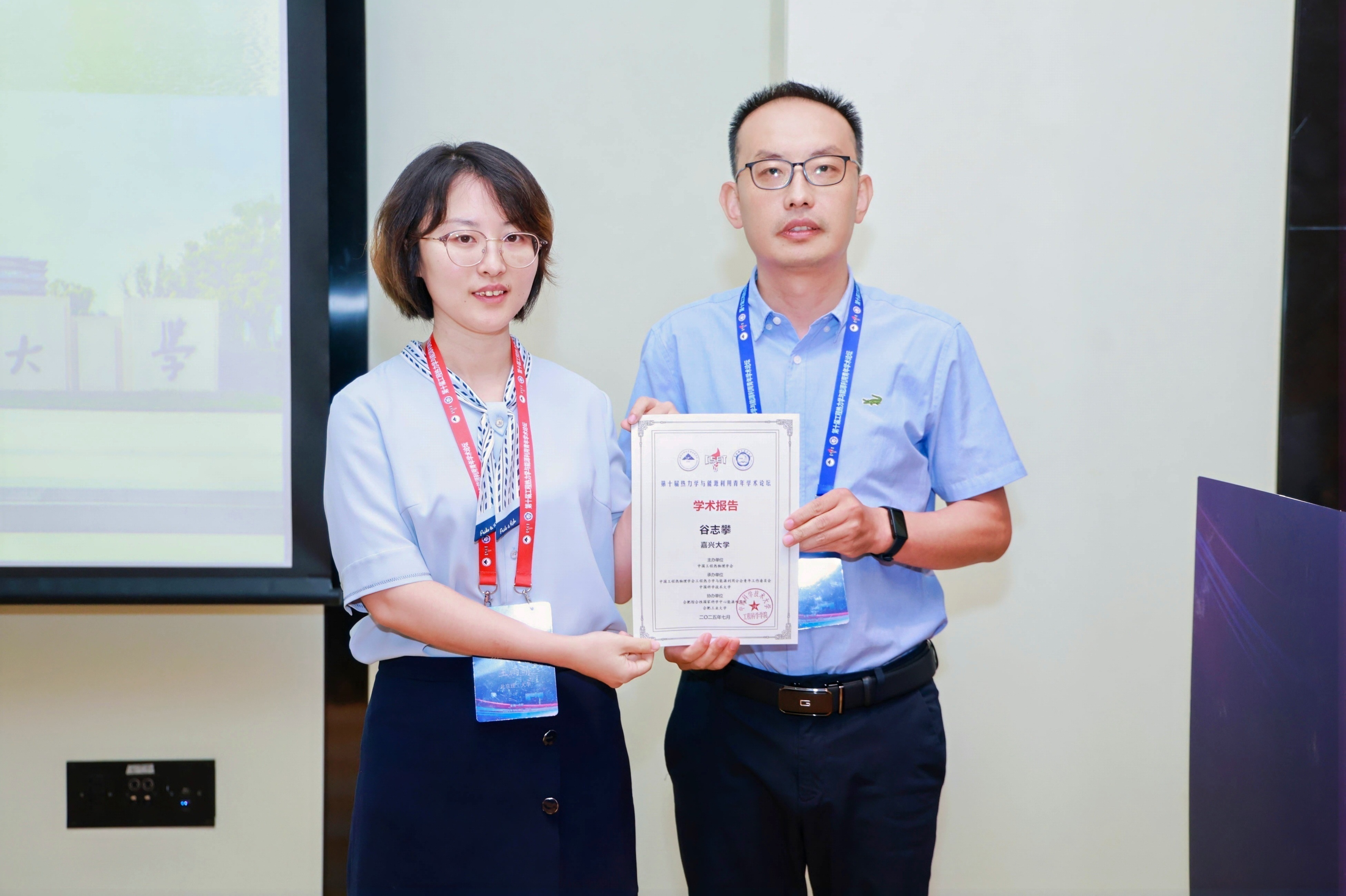 会议期间,谷志攀与侯景鑫两位老师认真聆听了大会报告,并就热力学与能源利用方面的研究热点,与国内众多青年学者进行交流探讨。谷志攀老师受邀在基础热力学分会场作题为《农产品太阳能干燥动力学模型优选及热力学特性分析》的学术报告。针对鲜贮农产品易腐损问题,研究团队构建了太阳能干燥装置,以山药为对象系统开展薄层干燥动力学分析。通过优选薄层干燥模型,采用拉普拉斯变换方法计算有效水分扩散系数,并基于Eyring-Polanyi方程解析活化能、焓变、熵变、吉布斯自由能变等热力学参数。该研究为农产品太阳能干燥提供了理论完善、方法创新的技术支撑,得到了分会场点评专家的好评,并引发了参会代表对本研究课题的兴趣与关注。谷志攀老师同时在分会场介绍了嘉兴大学建筑工程学院及太阳能热泵科研团队的情况。