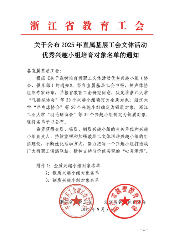 近日,浙江省教育工会公布《关于公布2025年直属基层工会文体活动优秀兴趣小组培育对象名单的通知》,我校多个教职工文体兴趣小组凭借扎实的组织建设、丰富的活动开展及显著的育人成效,成功入选。