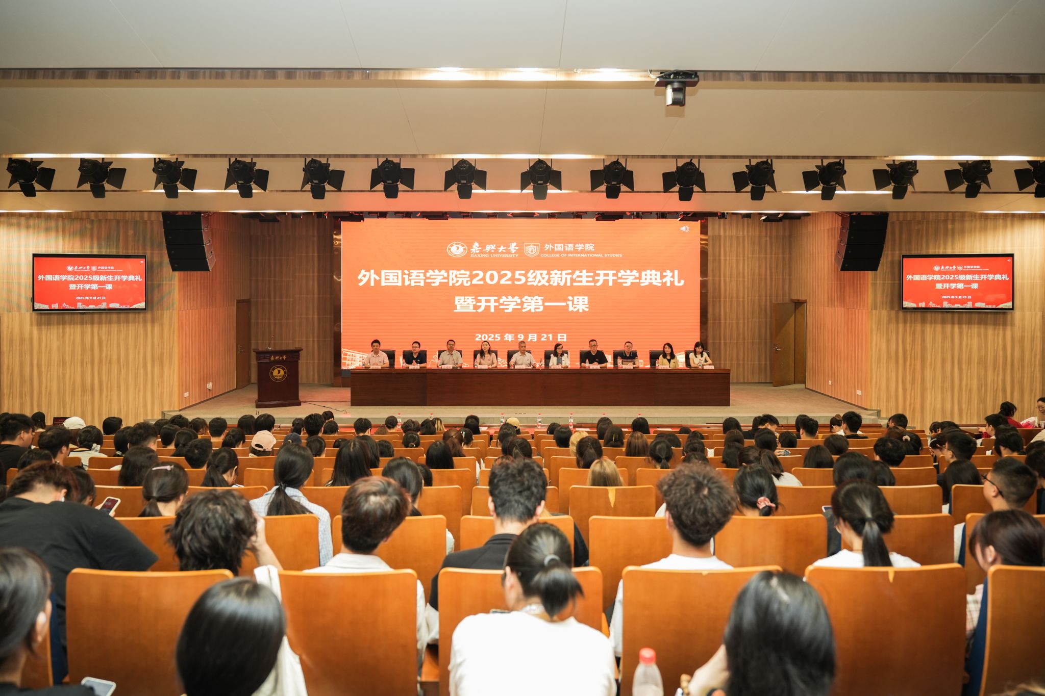 9月21日,外国语学院2025级新生开学典礼暨开学第一课在图书馆一楼报告厅举行。学院党政领导、党委委员、各系(部)主任、新生班主任、辅导员、助理辅导员、生涯导师代表、高年级导生代表以及2025级全体新生齐聚一堂,共同开启大学新征程。典礼由学院党委副书记张啸峰主持。