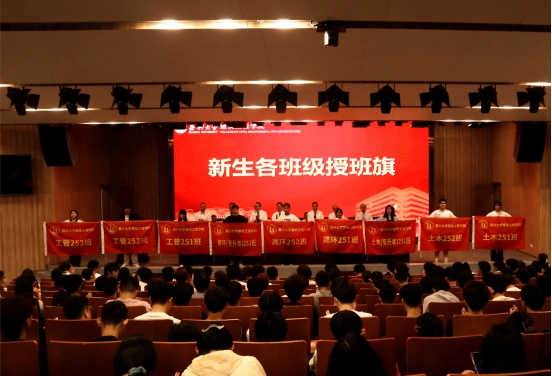 在授班旗仪式上,学院领导将一面面设计精美的班旗郑重地交到各新生班级代表手中。这不仅是一面旗帜,更是一种责任与使命的传递。