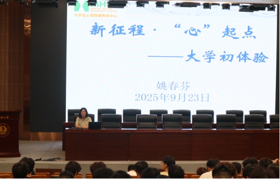 典礼之后,心理健康教育中心姚春芬老师为新生带来了心理适应专题讲座。围绕“心理适应”这一核心主题,姚老师从“环境适应、学业适应、人际适应、情绪管理、自我认同”五大维度展开深入讲解。她结合大量真实案例,剖析了新生常见的心理困扰,如“孤独感”“迷茫感”“比较焦虑”“时间管理混乱”等,并提出科学、实用的应对策略。