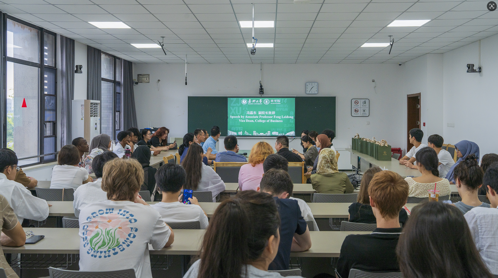 冯磊东代表学院对2025级国际新生的到来表示热烈欢迎。他回顾了商学院的百年商科教育和国际化发展历程,介绍了学院在国际交流合作、学科建设和人才培养等方面取得的成果。他指出,商学院始终秉持开放、融合、创新的办学理念,致力于为国际学生提供多元化的学习平台,并鼓励大家珍惜留学时光,勤奋诚信,融入中国文化,努力成长为具有全球视野与社会责任感的国际化人才。