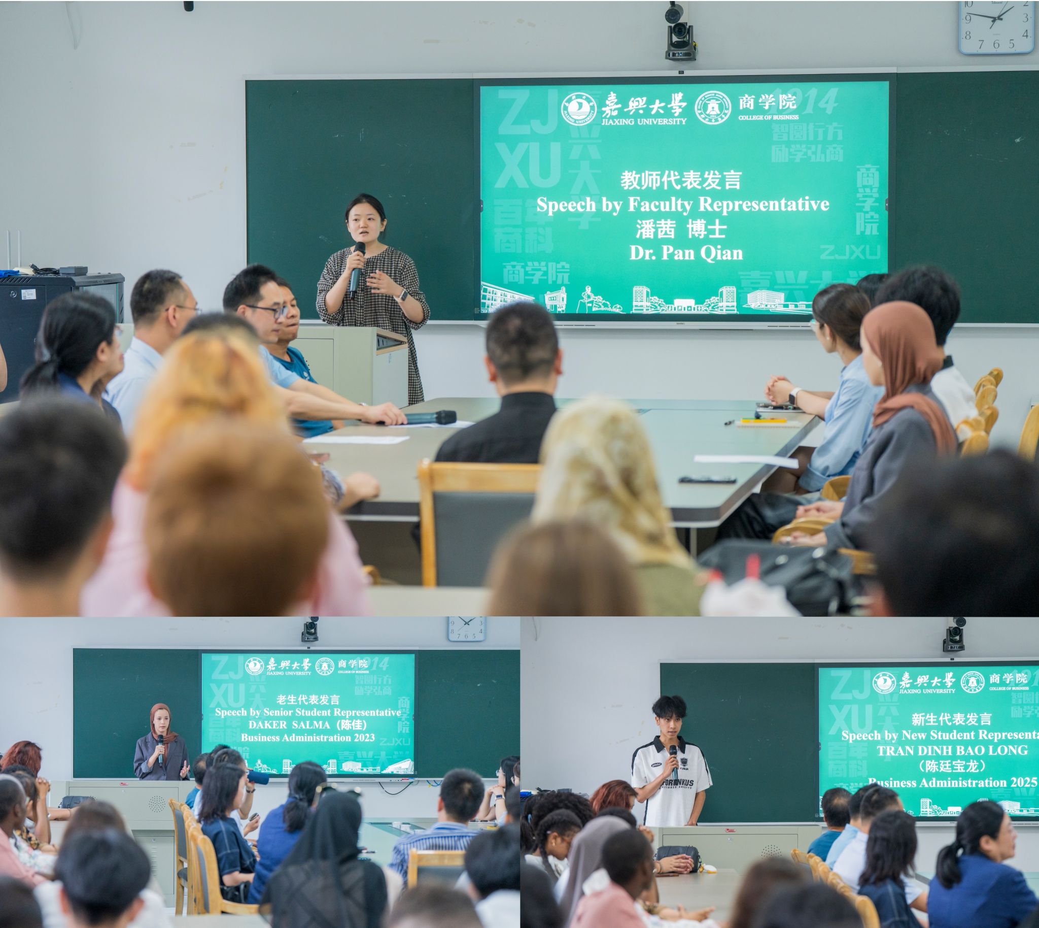 随后,工商管理系教师代表潘茜博士、2023级老生代表DAKER SALMA以及2025级新生代表陈廷宝龙分别发言。潘茜博士代表教师向新生表示热烈欢迎,并鼓励大家保持好奇心与学习热情;DAKER SALMA分享了在商学院学习生活的收获与感悟;陈廷宝龙代表新生表达了对未来学习生活的期待与信心。