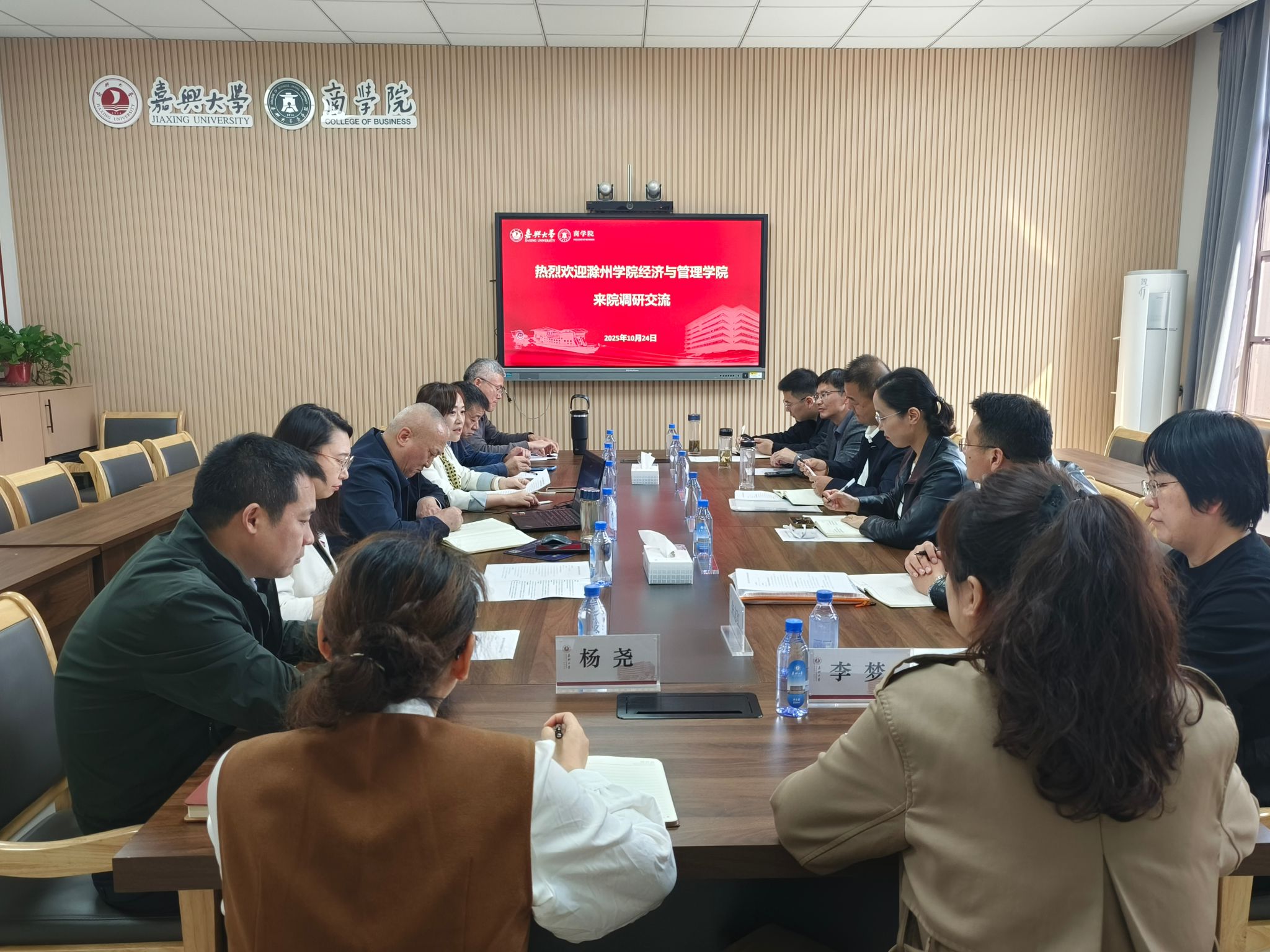 10月24日下午,滁州学院经济管理学院党委书记张悦、院长王琦一行来商学院调研交流。商学院院长李勇、党委书记虞岚、学术副院长智佳宁及相关负责人参加座谈。会议由李勇主持。