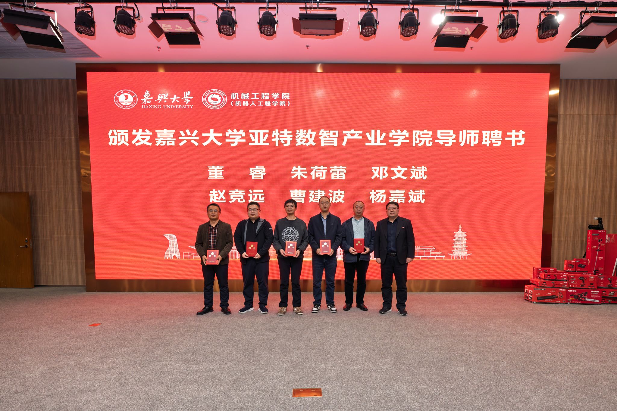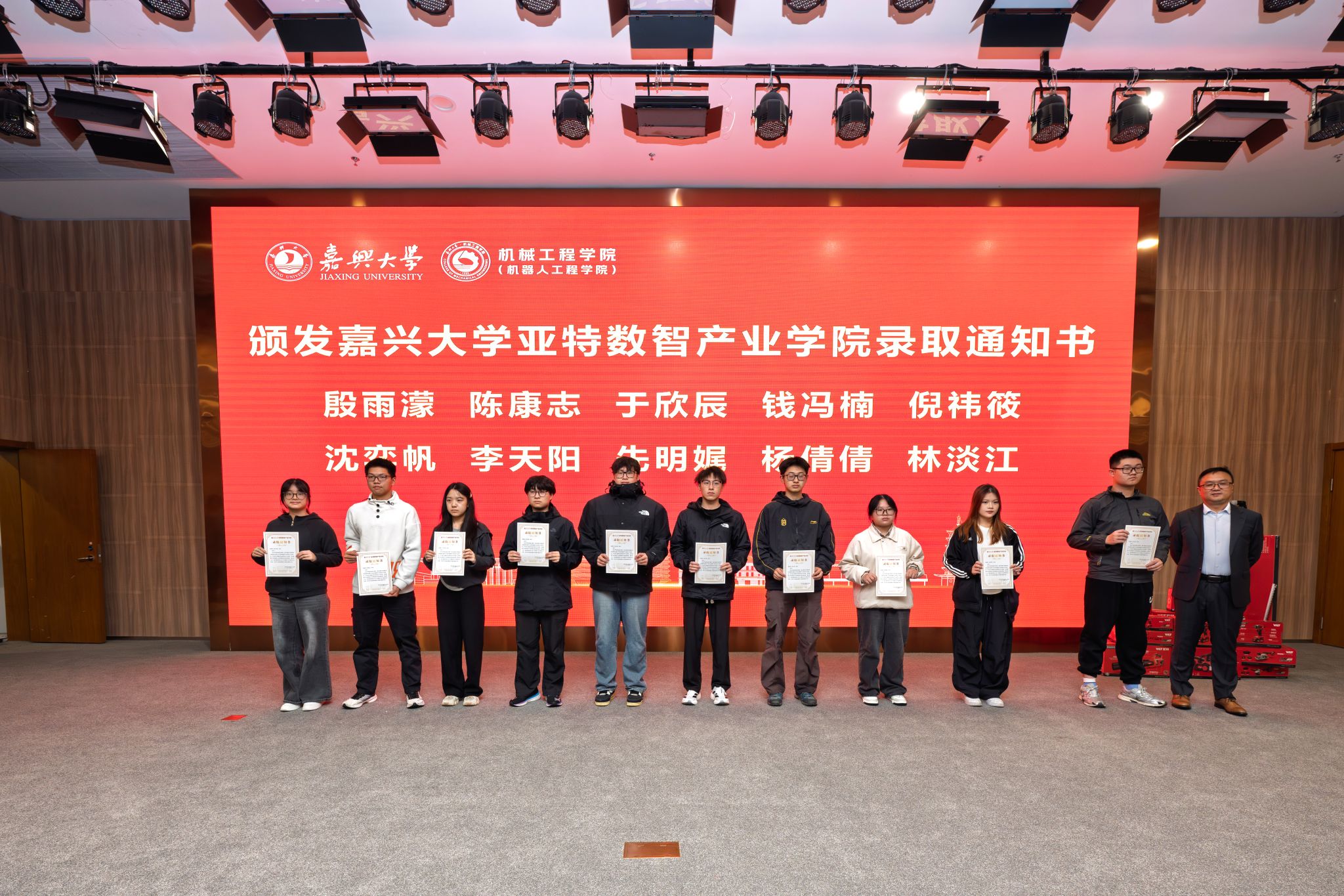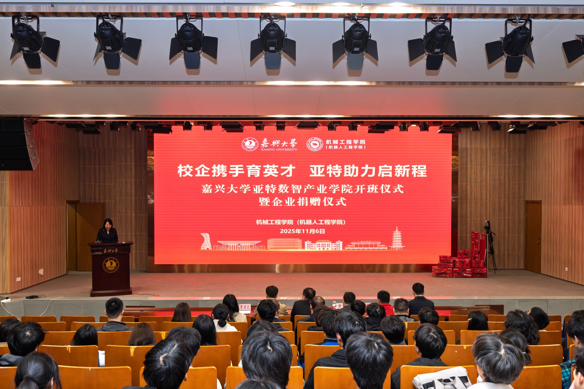 11月6日,嘉兴大学亚特数智产业学院开班仪式暨企业捐赠仪式在图书馆报告厅顺利举行。浙江亚特电器股份有限公司总经理劳崮,人事部经理栾伟,机械工程学院(机器人工程学院)院长朱耀东、党委书记战昕、党委副书记李寒星,机械工程系主任曹建波、智能装备产业学院院长助理杨超及产业学院导师、产业学院全体学生等70余人参加仪式,仪式由战昕主持。