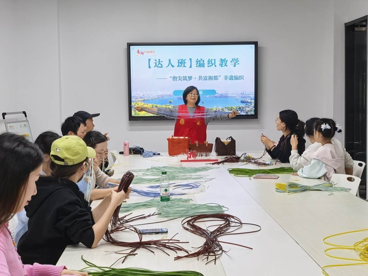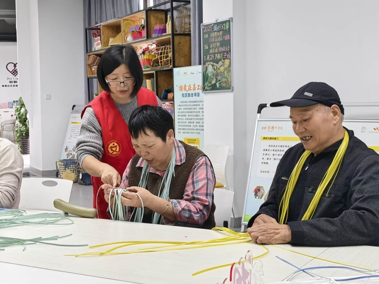 张新克老师充分发挥专业优势,整合高校资源与社区需求,联合本土编织达人组建教学团队,针对不同基础的居民开设分层课程体系,为零基础群体开设普惠基础班,提供基本编织技能培训,为有基础的爱好者开设达人培训班,系统讲授四角花、人字纹等传统编织技法。