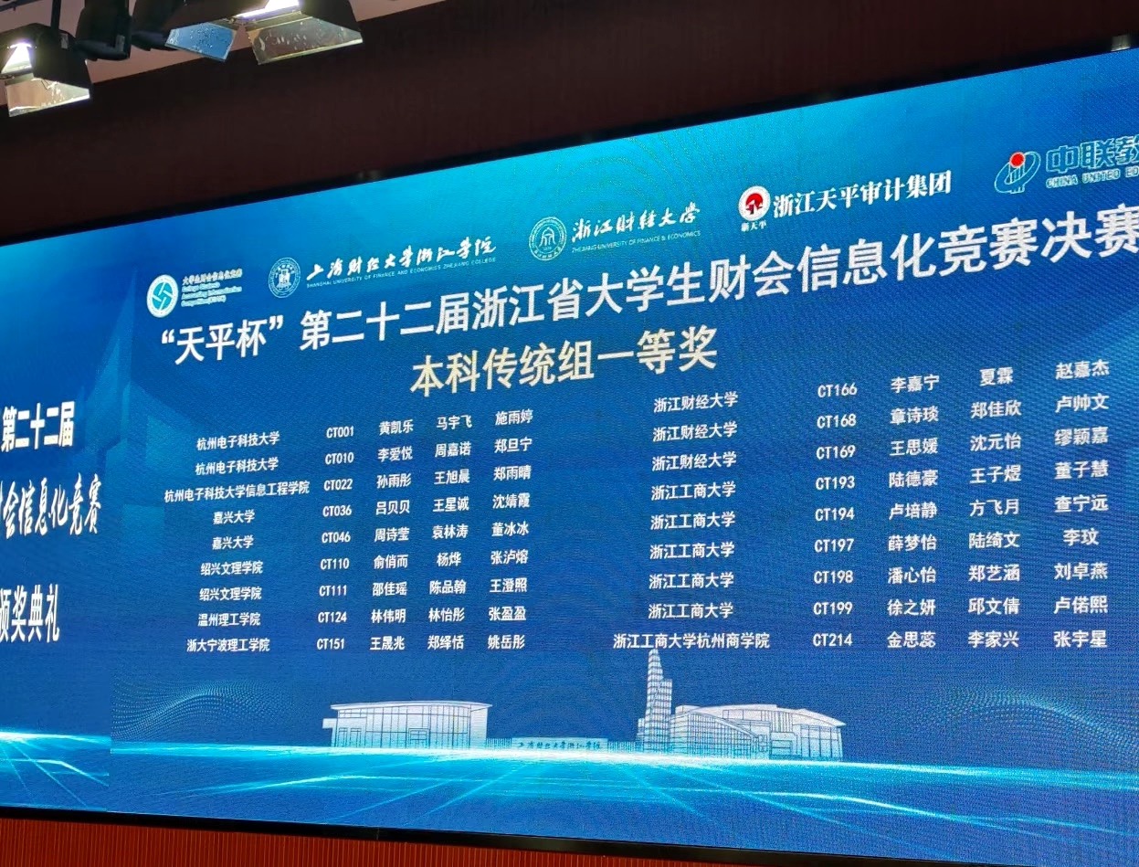 在刚刚落幕的“天平杯”第二十二届浙江省大学生财会信息化竞赛中,嘉兴大学学子表现卓越,共荣获19个奖项,获奖总数与质量均创历史新高。其中,本科生组获一等奖3项、二等奖5项、三等奖8项,研究生组获二等奖2项、三等奖1项,整体获奖率达82.6%。