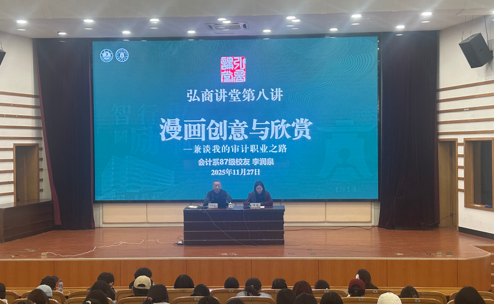 11月27日,商学院“弘商讲堂”第八讲在梁林校区TCL国际会议报告厅举行。本次讲座特邀中国美术家协会会员、中国新闻漫画研究会会员、江西省美协漫画艺术委员会第一副主任、商学院会计系87级校友李润泉先生作“漫画创意与欣赏—兼谈我的审计职业之路”专题分享。讲座由商学院党委副书记潘欣主持,470余名学生参加。