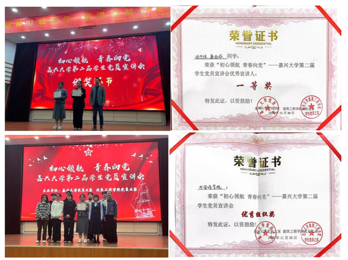 11月30日,嘉兴大学第二届“初心领航 青春向党”学生党员宣讲会在TCL报告厅举行。外国语学院凭借出色表现,荣获“优秀宣讲人一等奖”与“优秀组织奖”。