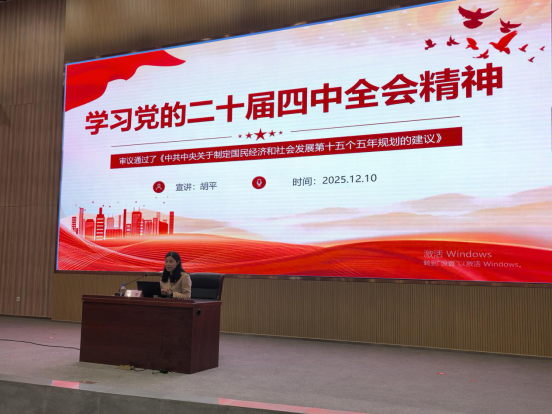 胡平副教授对党的二十届四中全会召开的背景、重大意义和核心要旨进行了系统阐述。她重点围绕全会审议通过的“十五五”规划建议报告,结合当前国内外形势与国家中长期发展战略,进行了全面深入的解读和辅导。