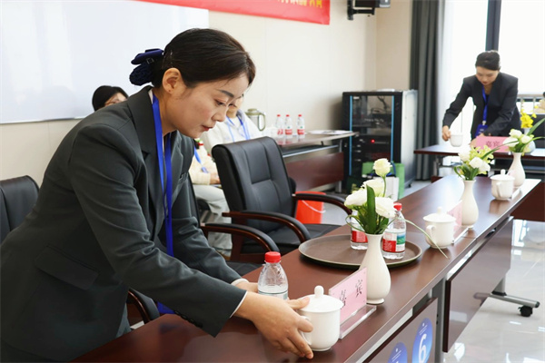大赛围绕会务工作核心,设置了理论知识测试,以及会议摆台、会务礼仪与茶水服务实操两大竞赛环节。在理论知识测试环节,试题内容丰富多样,全面聚焦会议策划流程、会务礼仪规范、消防安全知识等多方面内容,对参赛人员的理论功底进行了综合考察。实操比拼模拟了正式会议的各类场景,参赛人员凭借清晰标准的引导语、规范得体的服务动作,充分展现出扎实过硬的会务服务专业素养。