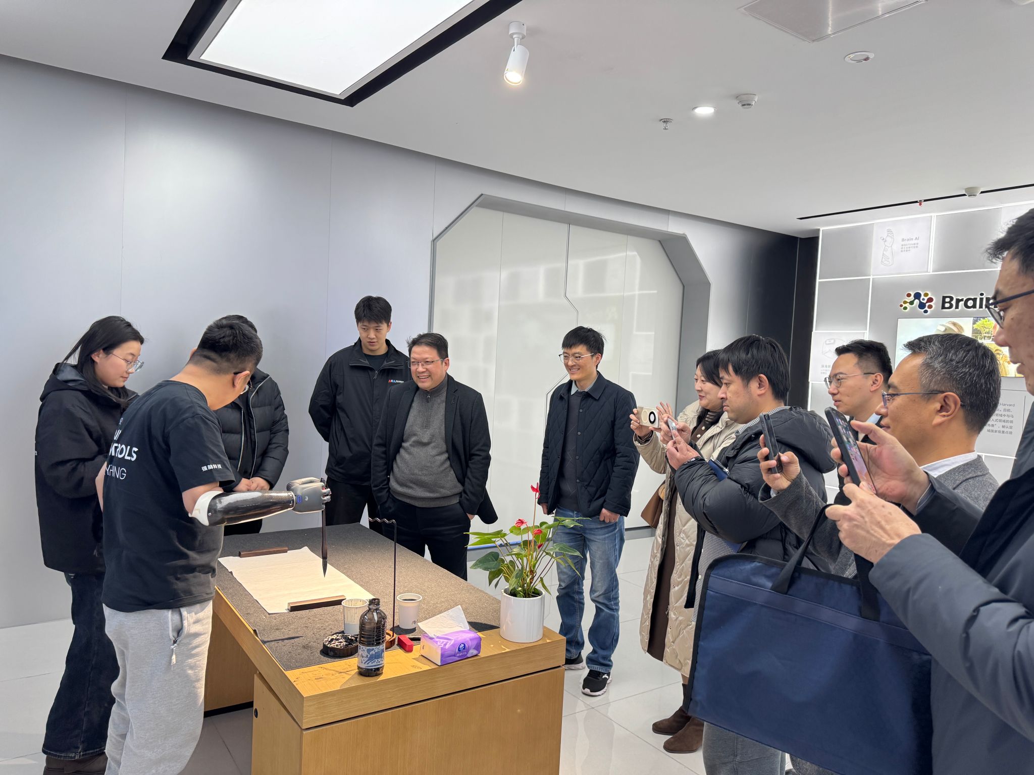 首先,学院一行在公司相关负责人的陪同下参观了杭州未来科技城脑机科学创新示范中心,近距离观摩了脑机接口技术的产业化应用成果。从可通过神经电信号精准实现抓握、捻动等动作的智能仿生手,到能适配跑步、户外等运动场景的智能仿生腿,再到助力舒压助眠的消费级脑机产品,详细了解了技术从实验室走向现实应用的全流程。现场,智能仿生手演示用毛笔即兴写字、演奏钢琴、拿取物品等精细动作,创新产品以“即装即用”“价格仅为欧美同类产品1/4”的优势,让大家对脑机接口技术的创新价值与应用潜力有了直观认识。