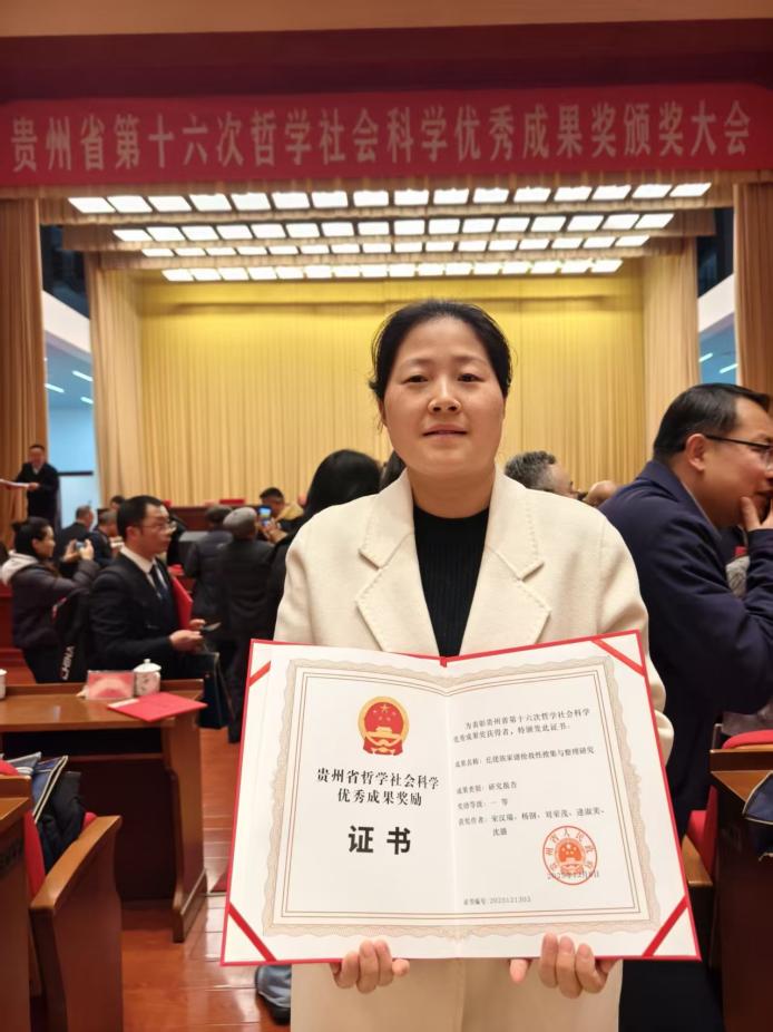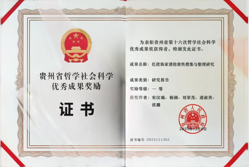 12月25日,贵州省第十六次哲学社会科学优秀成果奖颁奖大会在贵阳举行。我校图书馆宋汉瑞老师作为第一完成人的国家社科基金结项成果《仡佬族家谱抢救性搜集与整理研究》,荣获研究报告类一等奖。