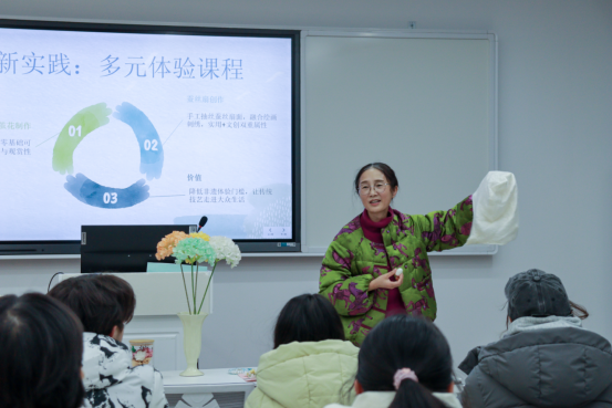 作为设计学院非遗教学体系的重要实践环节,本次活动延续了学院“理论+实践”的教学特色。授课中,周利萍老师围绕“非遗溯源、匠心践行、活态新生、总结展望”四大板块,系统阐释了蚕桑习俗源于江南农耕文化的历史脉络,详解了养蚕、缫丝、制被等核心技艺,以及“女儿红嫁妆蚕丝被”承载的婚嫁文化与民生期许。她结合自身深耕非遗传承的经历,分享了校园推广非遗的实践心得,让师生深刻体会到传统技艺背后的工匠精神与文化底蕴。