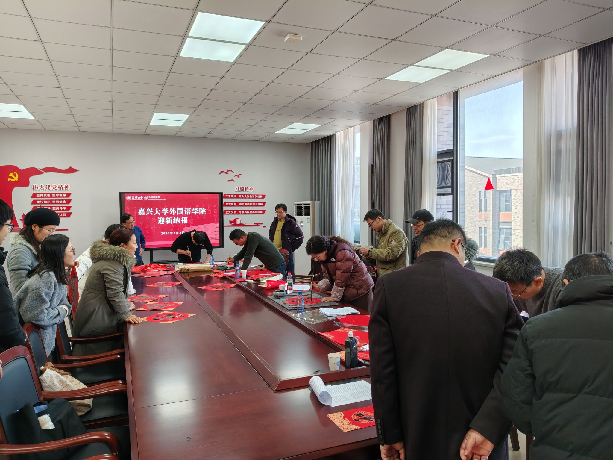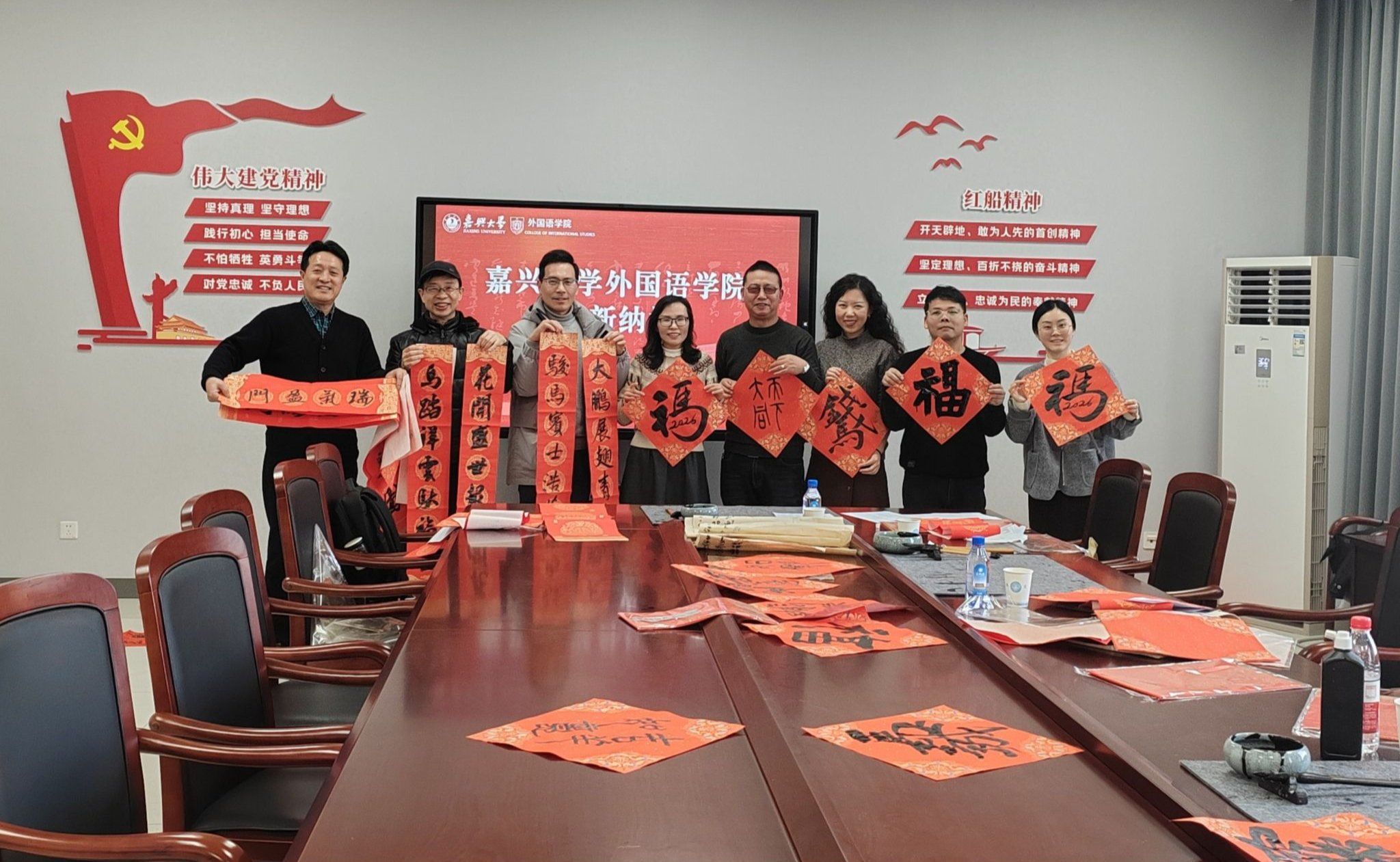 1月8日中午,外国语学院举办“迎新纳福”送春联活动。活动特邀南湖书画院童勇军、陈荣军、马国祥、高珂译等老师现场挥毫,以笔墨寄情,为全院教师送上诚挚的新春祝福。