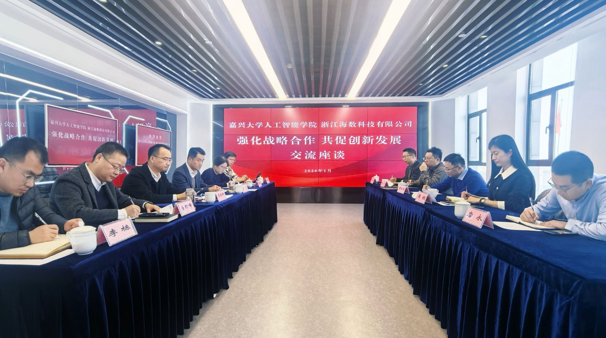 1月13日下午,人工智能学院与浙江海数科技有限公司举行战略合作签约暨研究生联合培养基地揭牌仪式。双方就党建联建、人才培养、技术研发与产业转化等多个维度达成深度合作意向,共同探索“人工智能+”时代下的校企协同发展新路径。海宁市城市发展集团有限公司党委书记、董事长苏钧辉,党委委员、副总经理徐凯毅,海数公司党支部书记、董事长、总经理唐烈峰及人工智能学院班子成员出席本次活动。
