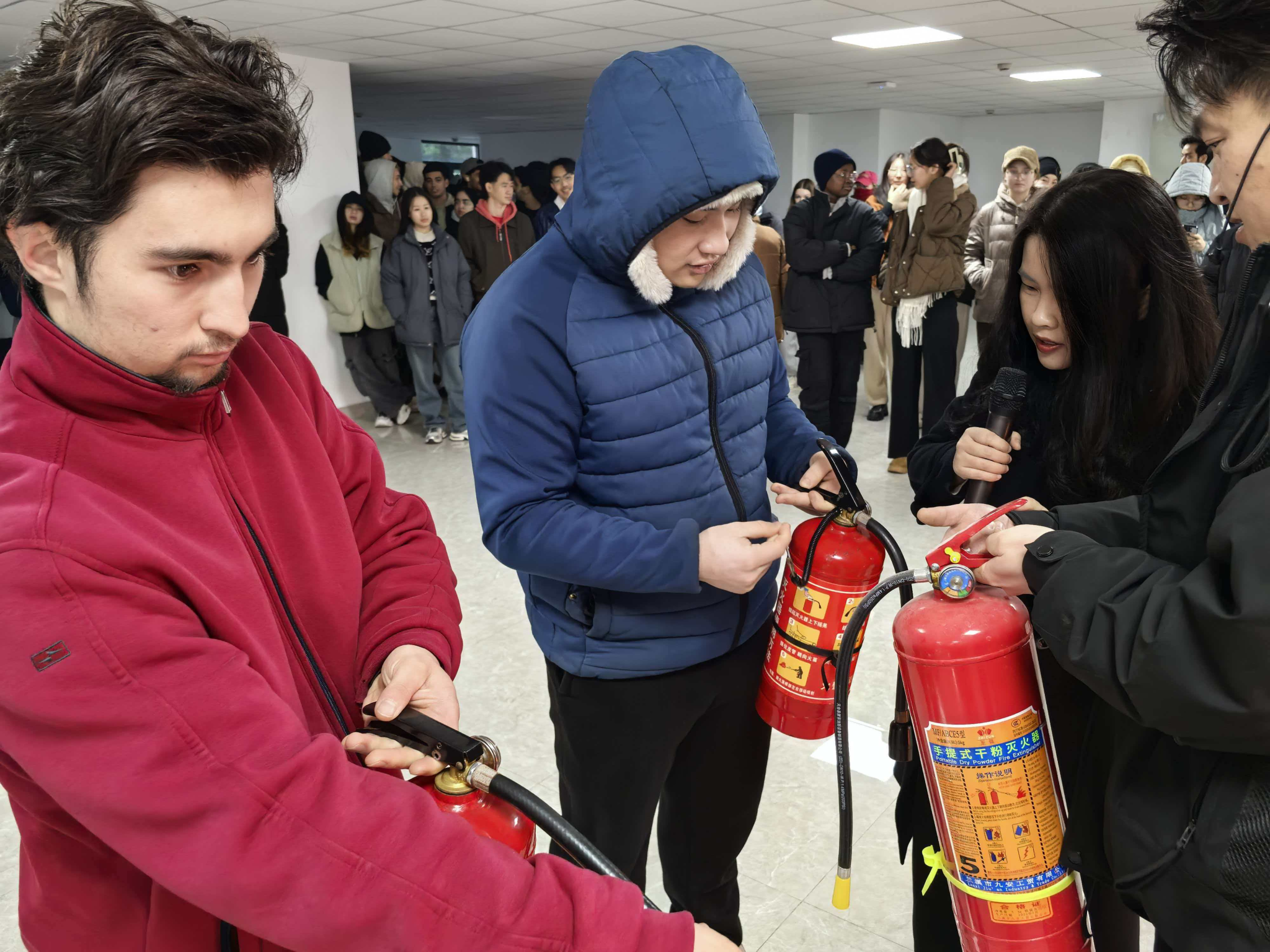 在培训环节,安全保卫部工作人员详细讲解了逃生面罩、灭火器的使用方法,以及火灾逃生中毛巾的正确捂护技巧,并组织留学生进行了灭火实操练习。