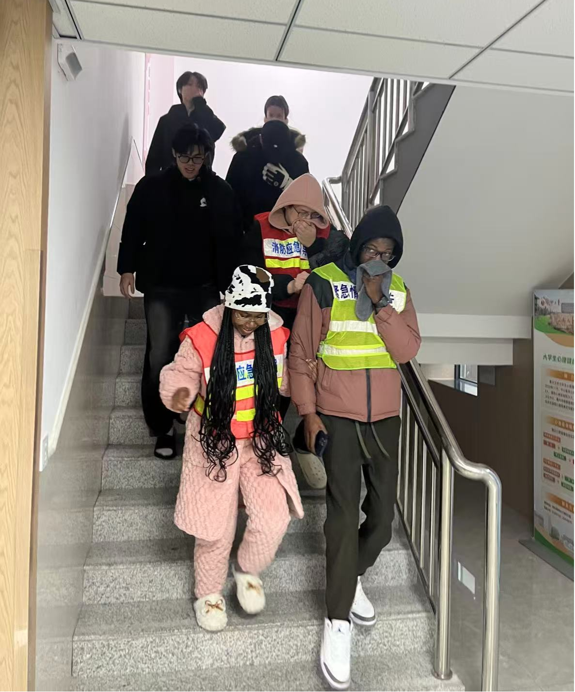 随后进行的应急疏散演练模拟了高层建筑发生火情。警报响起后,留学生在引导员的提醒下,严格遵循“低姿弯腰、捂好口鼻、不乘电梯、有序撤离”的原则,快速通过烟雾区域,撤离至空地集合。消控人员、校警队员与消防救援人员按预案展开初期火灾扑救与联动处置。整个过程职责明确、响应迅速、配合紧密。在撤离集合点,国际教育学院老师迅速清点人数,确认全体人员安全到场。