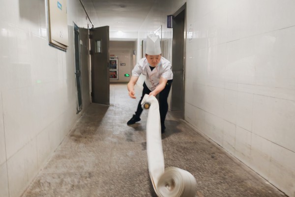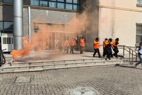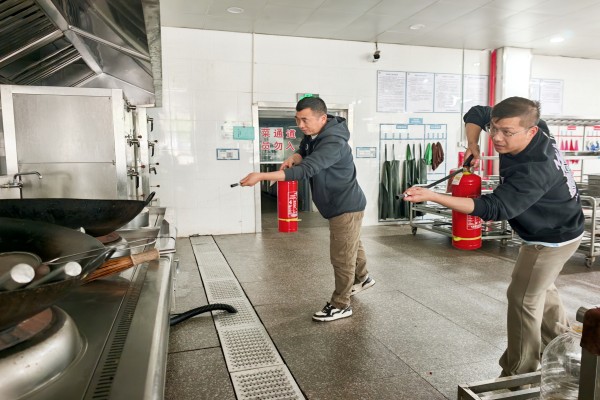 演练模拟食堂工作区域突发火情。现场工作人员依据应急预案,迅速模拟报警、切断电源及燃气阀门、使用灭火器扑救,并引导参演人员疏散。参演人员用湿毛巾捂住口鼻,弯腰低姿,以最快且有序的速度向指定空旷安全区域撤离。整个疏散过程紧张而有序,待参演人员全部撤离到达指定位置后,各部门清点人数,确认无人员滞留模拟火灾现场。