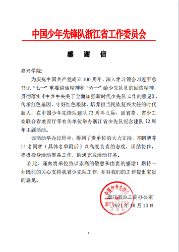 10月11日下午,由共青团浙江省委、浙江省文明办、浙江省教育厅、浙江省少工委主办的浙江省少先队纪念建队72周年主题活动。文法学院《初心》团队在当天主题活动中演出了情景剧《开天辟地》。嘉兴市委书记张兵及团省委领导等与来自全省各地的少先队工作者、少先队员代表200余人一同观看了演出。 会后,共青团浙江省委给学校发来了感谢信,对《初心》团队成员的精彩表现给予充分肯定。