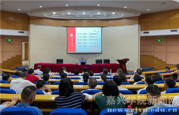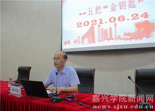 杨培强围绕“高超的战略思维、科学的理念方法、诚挚的为民情怀、务实的工作作风、崇高的人格魅力”这五把“金钥匙”进行了详细讲述。他强调,时代召唤使命、使命引领担当,党员同志要忠实践行“八八战略”,奋力打造“重要窗口”,为浙江省争创社会主义现代化先行省贡献智慧和力量;要坚持贯彻创新、协调、绿色、开放、共享的新发展理念,推动学校内涵式发展;要坚持以人民为中心的价值立场,贯彻办法就在群众中的工作路线,树立与群众同甘共苦的赤子情怀;要用发展着的马克思主义指导新的实践,大兴调查研究之风,以钉钉子精神抓落实;要培养崇高的人格魅力,忠诚初心使命、以身许党许国、从严正己正人。