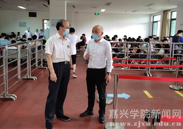 5月27日下午,副校长杨培强在后勤服务中心副主任兼校医院院长胡斌的陪同下,赴学校体育馆接种方舱检查指导疫苗接种工作,并看望慰问了医务人员、工作人员和学生志愿者。