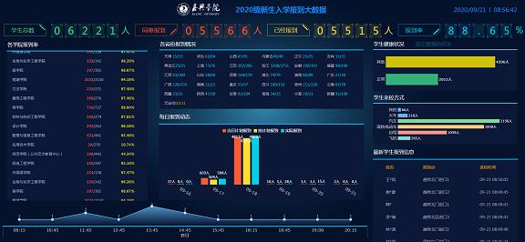 坚持“一屏知晓”,利用大数据平台,通过“新生报到大屏”实时展示报到信息,精准掌握新生健康动态信息,确保各学院新生实时报到数据一目了然。同时,对新生数据进行个性化分析,实现了疫情防控数据精准化、防控过程高效化,使学校决策更具针对性和有效性,为学校疫情防控工作给予了有力支撑。