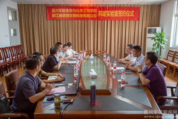6月12日下午,生化学院在梁林校区1号楼与浙江威诺姆生物科技有限公司举行共建实验室签约仪式。生化学院院长周宏伟、副院长张瑾,浙江威诺姆生物科技有限公司执行董事兼总经理朱冯光、副总经理陆钰铭,嘉兴市平湖曹桥街道副主任寿钢军出席仪式,实验中心副主任徐松、系务委员尤忠毓及骨干教师黎梦博士参加仪式。仪式由环生系副主任朱长俊主持。