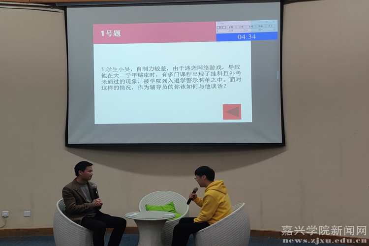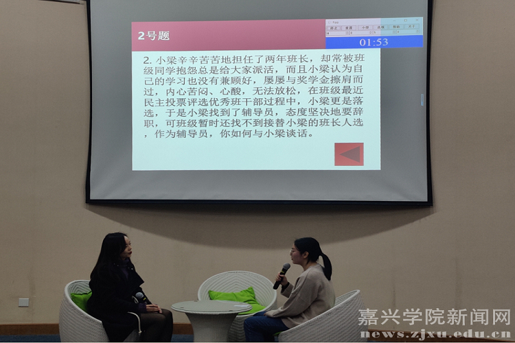 本次谈心谈话比赛主要考察辅导员对相关理论政策、学生特征、学生成长成才规律的了解把握及对问题的解决能力和对学生的教育引导能力。参赛选手提前10分钟抽题,根据题目要求,以情景再现的方式开展谈心谈话。