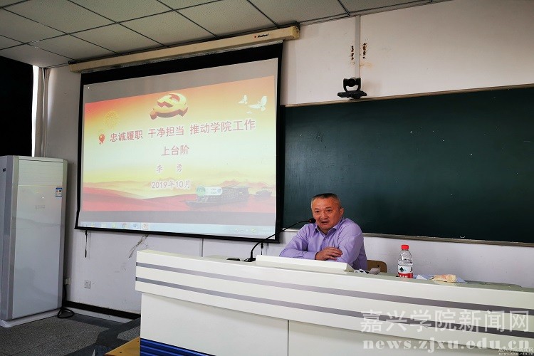 10月31日下午,应用技术学院党总支书记李勇在平湖校区明德楼多媒体教室为学院全体教职工讲授“不忘初心、牢记使命”主题教育专题党课。
