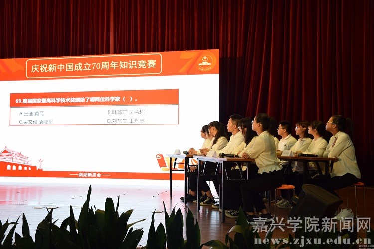 9月27日晚,南湖学院“辉煌七十载 建功新时代”庆祝新中国成立七十周年时政知识竞赛在教二报告厅举行。嘉兴学院党委宣传部常务副部长陈立力,纪委副书记、纪检监察室主任黄金珠,党委组织部副部长姚颖超;南湖学院院长袁志明、党委书记胡文蔚、副院长仇恒喜出席活动。学院600余名师生观看比赛。
