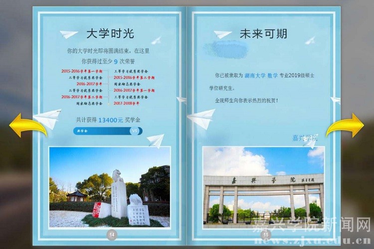 6月6日上午,经过两个多月的精心准备,我校2019届毕业生大学生涯画像电子纪念册首次推出并正式上线。该电子毕业生纪念册是根据学生在校期间表现生成的数据画像,6500多名毕业生可通过微信公众号“微嘉院学工”首篇推文,根据提示登陆网址查询。