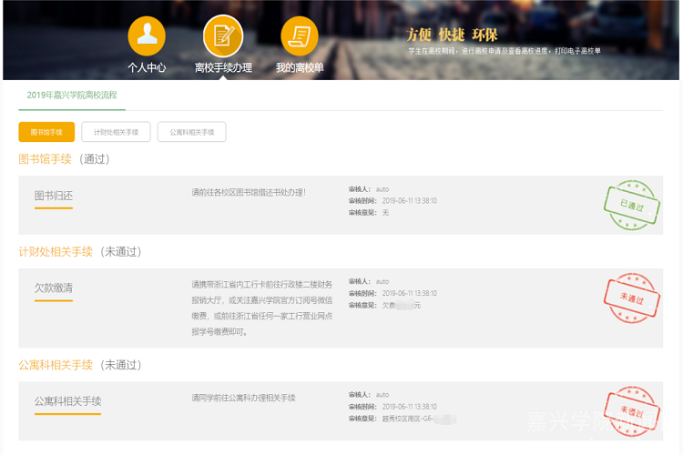 该系统将传统的离校手续办理方式,变更为网上操作。系统启用后,校本部、平湖校区、嘉兴学院南湖学院2019届毕业生均可通过PC端和手机客户端快速查询掌握个人离校手续办理进度,顺利完成个人离校手续。业务部门和学院可通过离校系统完成手续办理、发布信息、数据获取、查询统计等一系列工作,大大提高了工作效率。