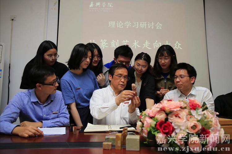 5月14日下午,设计学院在6号楼会议室举办《让篆刻艺术走向大众》理论学习研讨会。设计学院院长、南湖书画院执行院长鲁恒心教授作专题辅导发言。校党委宣传部常务副部长陈立力,基建处副处长、南湖书画院副院长童勇军以及20余位师生代表参加会议。