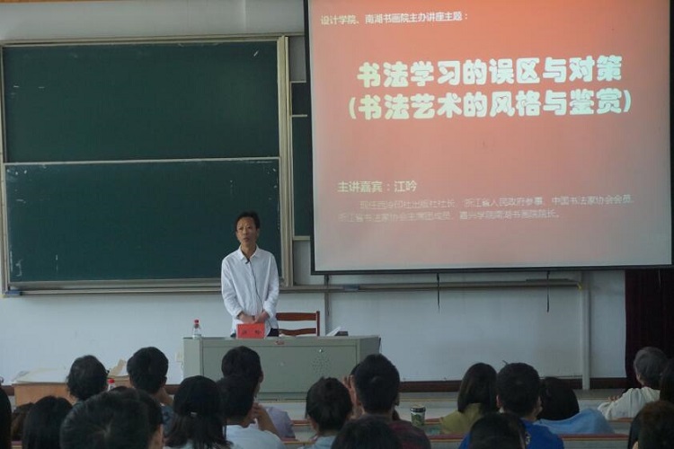 5月22日下午,设计学院及南湖书画院在七号楼报告厅联合举办《书法学习的误区与对策》主题讲座。讲座邀请到西泠印社出版社社长、浙江省人民政府参事、中国书法家协会会员、浙江省书法家协会主席团成员、我校南湖书画院院长江吟主讲。设计学院院长、南湖书画院执行院长鲁恒心教授主持讲座。全校200余位师生代表和书法爱好者聆听讲座。