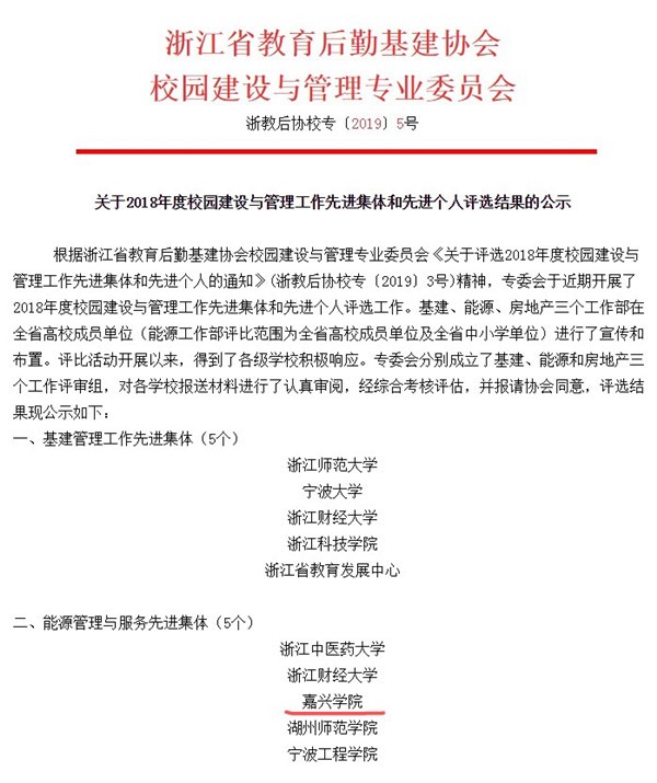 4月19至20日,浙江省教育后勤基建协会校园建设与管理专业委员会年会在温州召开。大会表彰了2018年度校园建设与管理工作先进集体和先进个人、节能“金点子”获奖者。我校荣获“2018年度校园能源管理与服务先进集体”荣誉称号。