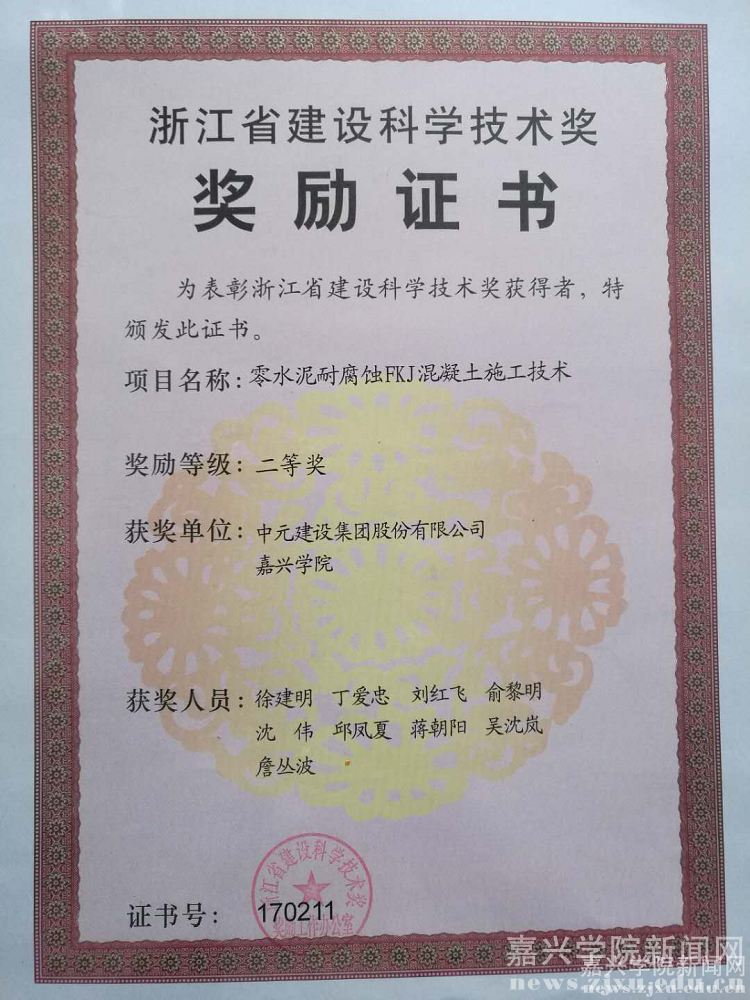 日前,2017年度“浙江省建设科学技术奖”正式发布,由我校和中元建设集团股份有限公司共同完成的《零水泥耐腐蚀FKJ混凝土施工技术》项目荣获二等奖。