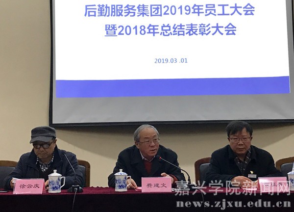 3月1日下午,后勤服务集团在行政楼一楼报告厅召开2019年员工大会暨2018年总结表彰大会。副校长费建文到会指导,集团党政班子成员,先进个人、先进集体代表,各部门骨干员工及全体在编员工等180余人参加会议。会议由集团党委书记徐云庆主持。