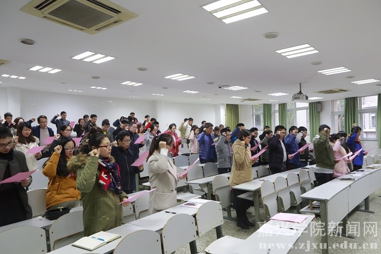 12月19日下午,学校在教一159教室举行2018年新教师入职培训班结业典礼暨入职宣誓仪式。全体110余名新入职教师参加典礼。副校长周亚新主持仪式并讲话。