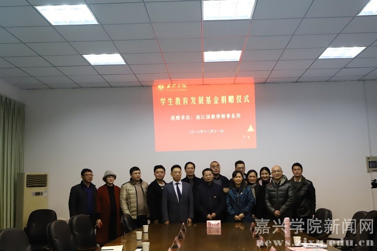 12月11日下午,浙江国毅律师事务所学生教育发展基金捐赠仪式在梁林校区1号楼426会议室举行。国毅律师事务所主任祝丹华、事务所嘉兴分所主任黄海明及学院党政班子成员、部分教师和事务所校友代表出席仪式。捐赠仪式由学院党委书记洪坚主持。