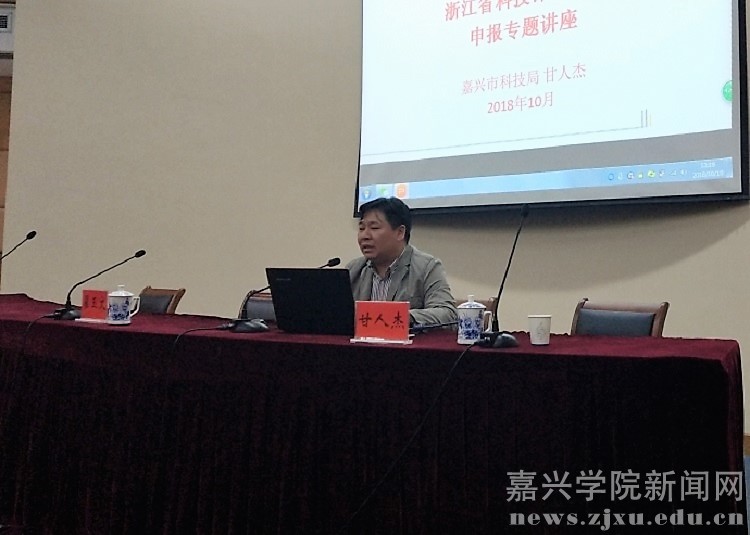 10月18日下午,作为庆祝南湖学院建院十五周年系列活动之一的青年教师科研指导讲座在行政楼一楼报告厅举行。嘉兴市科学技术局综合计划处处长甘人杰应邀为学院青年教师作《浙江省科技计划项目申报指导》专题讲座。讲座由南湖学院副院长翟玉文主持。