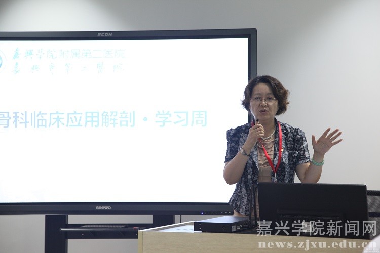 黄嬛致辞,感谢在嘉兴学院附属第二医院的合力下,医学院承办此次培训班,并介绍了医学院的基本情况。她表示,医学院拥有医学虚拟仿真实验中心与解剖实验室,希望借助这些平台,为广大学员提供更多虚实操作和自主学习的机会。
