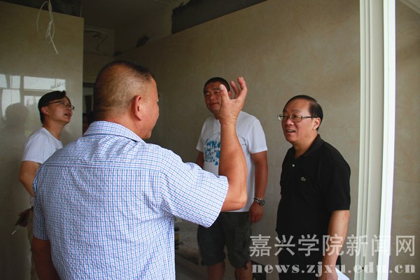 施工现场,费建文一行对越秀校区教工宿舍1号楼、学生公寓6、学生公寓7,梁林校区1号楼、学生公寓5等施工现场进行了逐一察看,详细了解了工程项目的实际进展情况和存在的难点问题,并对施工人员的辛勤工作表示了慰问,对暑期仍然坚守岗位的工作人员表示感谢。