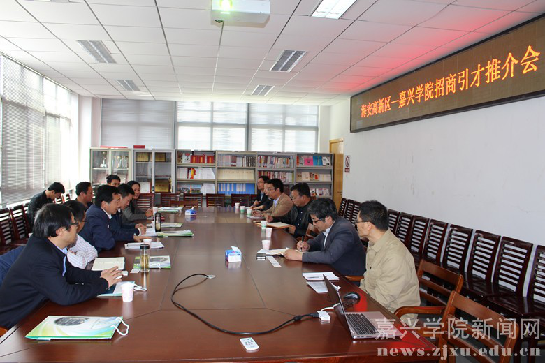 4月27日,江苏南通市海安高新区——嘉兴学院招商引才推进会在我校材纺与纺织工程学院举行。海安高新区南城街道仁桥办事处党委书记钱桂生、海安高新技术产业开发区管委会副局长邰国圣以及海安企业家代表一行8人出席推进会。校科技处副处长兰平,材纺学院党政领导班子和相关教师代表参加会议。