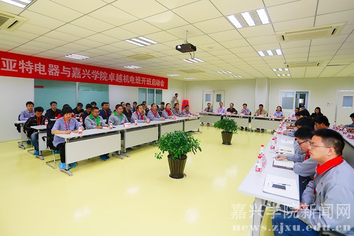 10月12日上午,亚特机电学院“卓越班”开班启动会在浙江亚特电器有限公司会议室举行。浙江亚特电器有限公司陈勇董事长、卢敏总经理,嘉兴学院社会合作处处长袁志明、教务处副处长彭文利、王敏、机电工程学院党委书记丁玉泉等相关负责人以及企业学校导师、全体卓越班学生参加了启动会。
