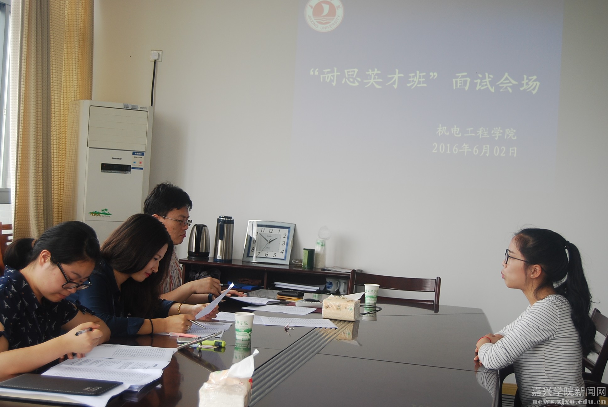 6月2日下午,嘉兴学院机电工程学院联合耐思电气(嘉兴)有限公司在14号楼303会议室举行首届“耐思英才班”招生面试。机电工程学院副院长高慧敏教授、耐思电气(嘉兴)有限公司人力资源部经理张静静女士担任评委。共有55位来自机电工程学院和商学院的2014级学生参加面试。经过长达8小时的面试,最终,来自机电工程学院的27名学生与商学院的5名学生成功进入“耐思英才班”。