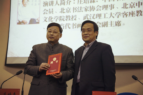 庄教授对中国书法艺术的发展历史及现当代书法艺术发展的形势作了精辟概括和深刻阐述,对古代经典碑贴进行了解读,分析了古代书法大家的书法艺术特点,并对当代优秀书法家的佳作进行鉴赏。庄教授还站在“文化强国”战略的高度,深刻分析了新的历史条件下推广中国书法教育、弘扬中国书法艺术的重要性。整个讲座深入浅出,图文并茂,使慕名前来学习的师生们开阔了眼界和思路,增强了弘扬中国书法艺术的责任感。